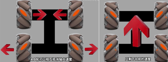 四個聚氨酯麥克納姆輪分別連接到電機上以進行獨立控制。 機器人可以像四個普通車輪一樣前進,后退和旋轉。滾子的配置在45°還允許機器人在任何方向上橫向移動并通過它們的組合(即使在旋轉?。?。我們將力量分成兩個向量,一個向前/向后和一個右/左。 當一側的車輪以相反的方向旋轉時,向前和向前旋轉向后向量抵消,而兩個橫向向量加起來。 與之相反另外兩個輪子導致四個增加的側向矢量。