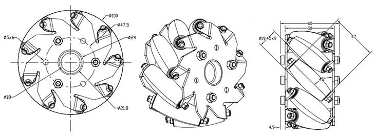依靠各自機輪的方向和速度,這些力的最終合成在任何要求的方向上產生一個合力矢量從而保證了這個平臺在最終的合力矢量的方向上能自由地移動,而不改變機輪自身的方向。在它的輪緣上斜向分布著許多聚氨酯滾輪,故輪子可以橫向滑移。小滾子的母線很特殊,當聚氨酯輪繞著固定的輪心軸轉動時,各個小滾子的包絡線為圓柱面,所以該輪能夠連續地向前滾動。麥克納姆輪結構緊湊,運動靈活,是很成功的一種全方位輪。有4個這種新型輪子進行組合,可以更靈活方便的實現全方位移動功能。